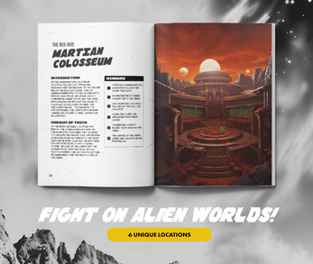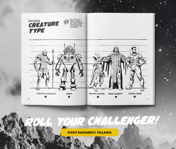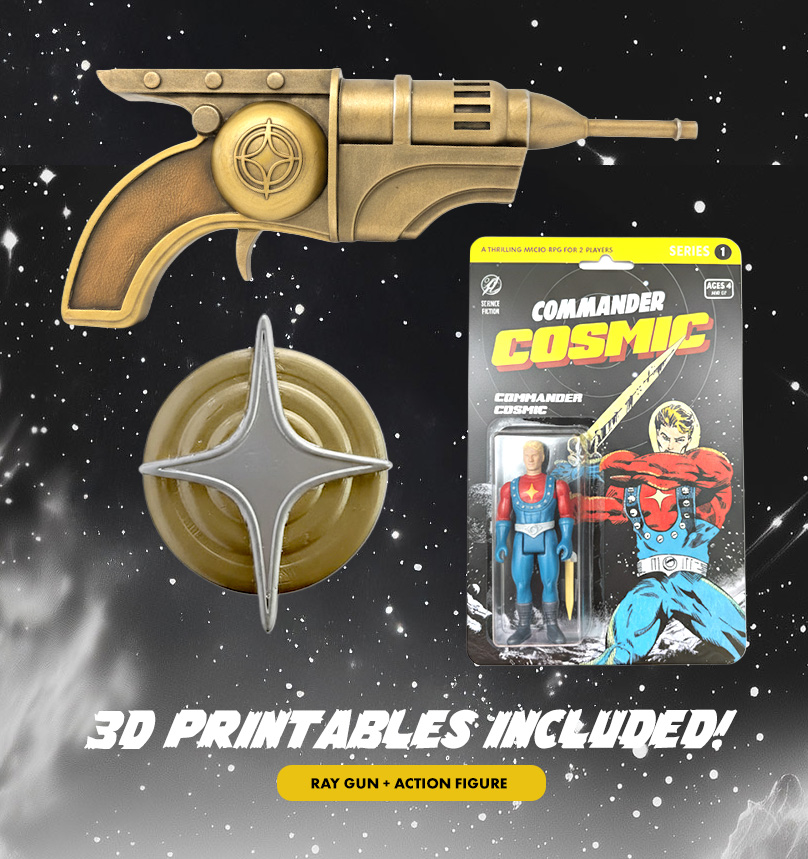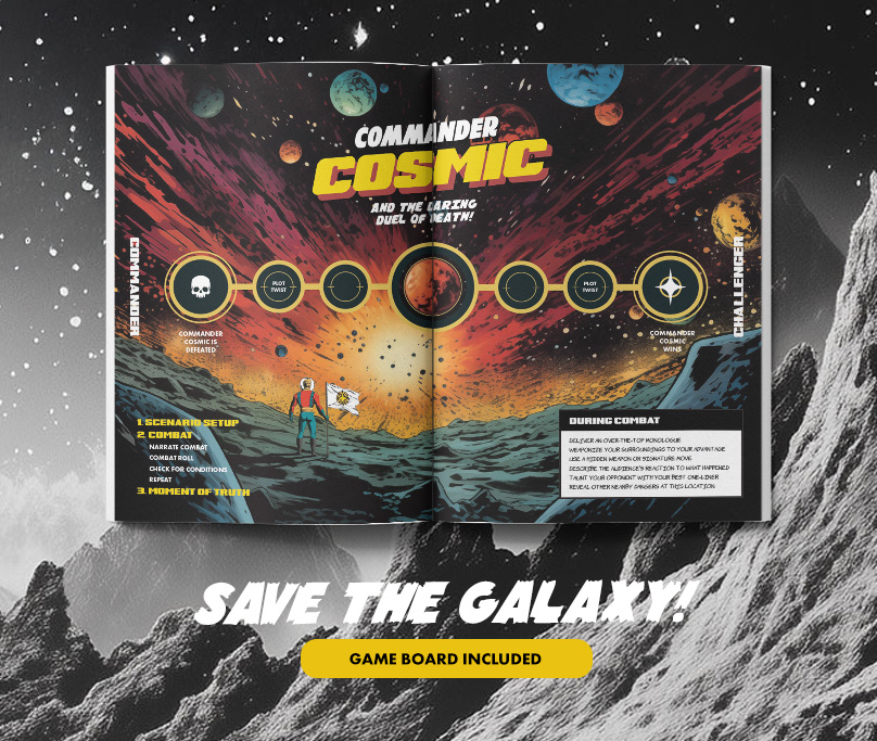 The game uses a light and engaging system to narrate duels between Commander Cosmic and their challenger. With just two six-sided dice, a Cosmic Token, and your imagination, you’ll weave epic tales of triumph or defeat. The game board keeps the stakes high, while scenario prompts and plot twists ensure no two games are alike.